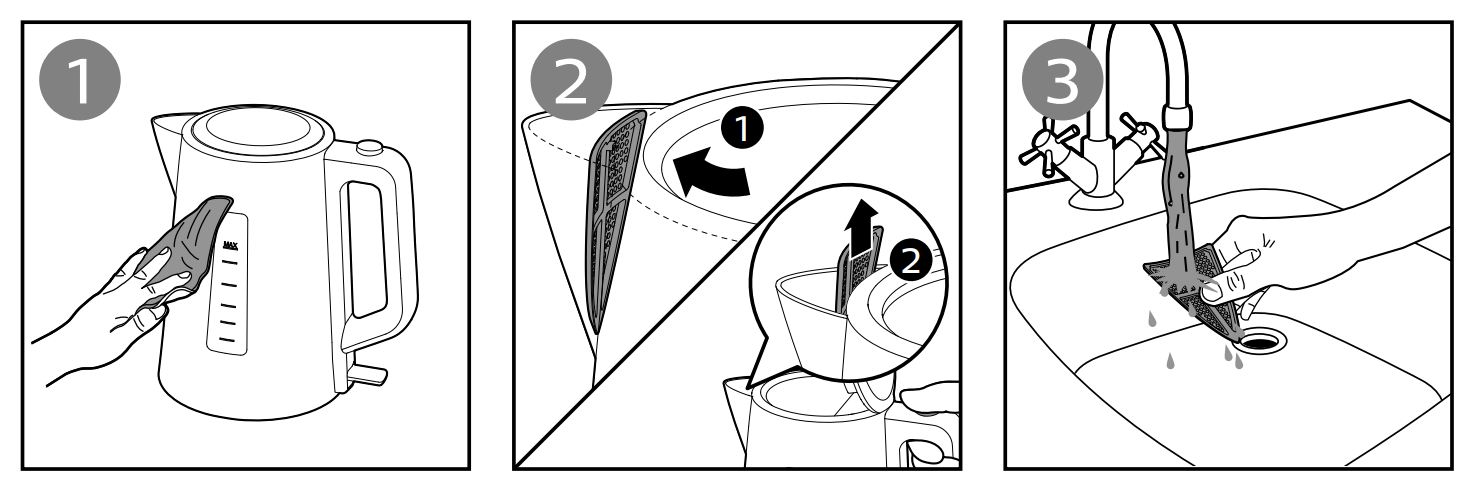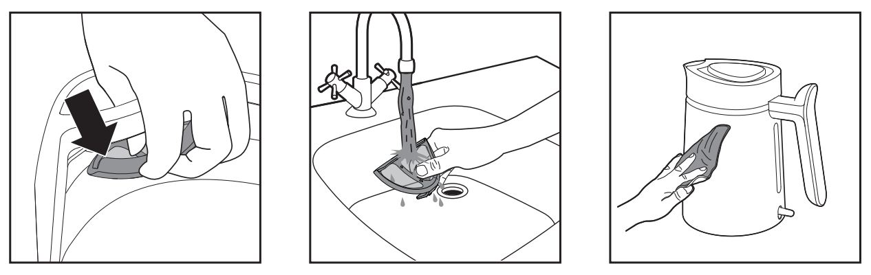 Извлеките фильтр и аккуратно очистите его под струей воды с помощью мягкой нейлоновой щетки. Фильтр также можно очистить, оставив его в чайнике во время очистки от накипи.